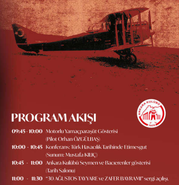 27 Ağustos 1922’de başlayan ve zaferle biten büyük taarruz bu yıl 30 Ağustos Tayyare ve Zafer Bayramı adı altında bir dizi etkinlikle kutlanacak. Etimesgut Belediyesinin Bağlıca’daki Tarih Müzesi ve Parkı’nda önce Türkiye’nin bir numaralı Yamaçparaşütü öğretmen pilotu Sayın Orhan Özgülbaş’ın motorlu yamaçparaşütü uçuşu ile etkinlik başlayacak.
