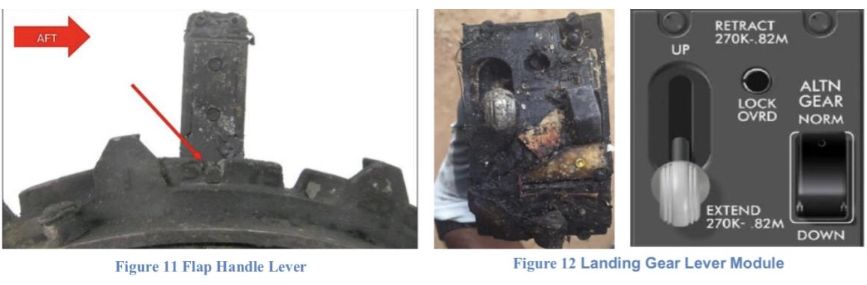 1. Flap kolu tertibatının (şekil 11) önemli termal hasara maruz kaldığı görülmüştür. Kolun, normal kalkış flap ayarıyla uyumlu olarak 5 derecelik flap pozisyonuna sıkıca oturduğu görülmüştür. Konum, EAFR verilerinden de doğrulanmıştır. İniş takımı kolu ise “AŞAĞI” konumundaydı. (şekil 12)