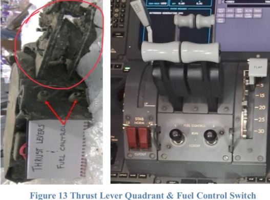 2. İtki kolu kadranı önemli termal hasara maruz kalmıştı. Her iki itki kolu da arka (rölanti) konumuna yakın bulundu. Ancak EAFR verileri, itki kollarının çarpışma anına kadar ileri (kalkış itkisi) konumda kaldığını gösterdi. Her iki yakıt kontrol anahtarı da “AÇIK” konumundaydı. (şekil 13) Motor İtki kolları bükülmüş ancak “kapalı” konumdaydı.