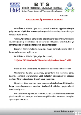 Devlet Hava Meydanları İşletmesi (DHMİ) Genel Müdürlüğü çalışanları, Eurocontrol Tazminatı uygulamalarında yaşanan eşitsizlikleri nedeniyle 18 Şubat 2026 tarihinde iş bırakma kararı aldıklarını açıkladı.