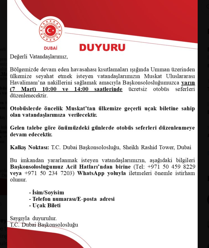 Dubai Başkonsolosluğu’ndan yapılan duyuruda, isteyen Türk vatandaşlarının Umman üzerinden tahliyesine yönelik, başkent Muskat’a ücretsiz otobüş seferleri düzenleneceği açıklandı.