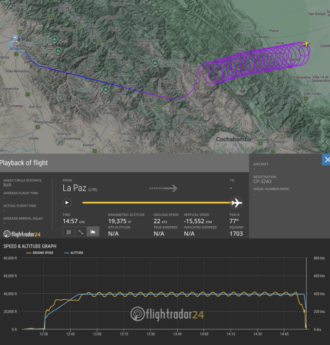 Uçuş kayıtlarına göre, CP3243 numaralı uçak 39.000 feet yükseklikte uçtu, yaklaşık 20 büyük daire çizdi ve iki saat sonra yere çarptı. Uçağın yakıtının bitmiş olması muhtemel. Uçuş başlangıçta Santa Cruz’a planlanmıştı ve uçakta sadece iki pilot vardı.