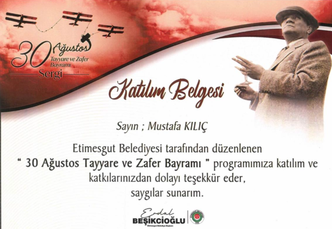 Atatürk’ten aldığımız ilham ile Etimesgut Belediyesinin ev sahipliğinde “30 Ağustos Tayyare ve Zafer Bayramı” sergimizi hazırladık. Sergide 16 Şubat 1925 tarihinde kurulan Türk Hava Kurumu tarihinden yansıyan belge, fotoğraf ve objelere yer vermeye çalıştık. Sergimizin diğer bir vurgusu ise; Ulu Yönder Mustafa Kemal Atatürk’ün havacılığa verdiği önem ve gelişimindeki rolüne de tanıklık etmektir.