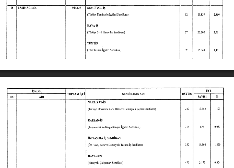 Taşımacılık işkolunda çalışanların yüzde 2.51’lik dilimi kapsayan Hava- İş’in üye sayısı 26.200, Hava-Sen’in ise 0,34 dilimle 3.175 oldu.