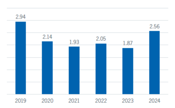 veriler sağlandıkça veri tabanına dahil edilecektir. Bunun, hesaplanan oranlarda yıldan yıla küçük değişikliklere neden olabileceğini belirtmekte fayda var. Grafik 7, son altı yıldaki küresel kaza oranı eğilimini (milyon kalkış başına) göstermektedir. 2024 yılında, bir önceki yıla göre %36,8 artışla milyon kalkış başına 2,56 kaza meydana gelmiştir. Bu, son beş yılın en yüksek seviyesidir, ancak pandemi öncesi 2019 yılına göre %12,8’lik bir düşüşe işaret etmektedir. 2024 yılında sertifikalı MTOW’u 5.700 kg’ın üzerinde olan uçakların tarifeli ticari operasyonlarını içeren kazalar Ek 2’de listelenmiştir.