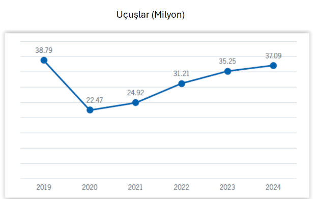 ICAO Büyük Veri’ye göre, Grafik 1’de belirtildiği gibi, küresel yolcu trafiği 2024 yılında büyümeye devam etti. Dünya çapında taşınan yaklaşık 4,528 milyar yolcu, 2023’teki 4,17 milyar yolcu sayısını geçerek, pandemi öncesi (2019) 4,5 milyar yolcu seviyesini de aştı. 2024’teki yolcu trafiği, 2023’e göre %8,6 arttı. Grafik 2’de belirtildiği gibi, tarifeli ticari operasyonlar için uçuş kalkış sayısı da %5,2 artarak 2023’teki 35 milyonun üzerindeki kalkışa kıyasla 2024’te 37 milyonun üzerinde gerçekleşti. Ancak bu rakam, pandemi öncesi (2019) seviyeden biraz daha düşük değerdedir.
