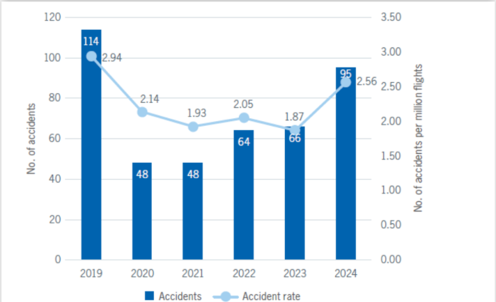 azaldı; ancak bu dönemde, hükümetlerin COVID-19’un yayılmasını en aza indirmeyi amaçlayan önlemleri nedeniyle hem yolcu hem de uçuş trafiğinde önemli bir düşüş yaşandığını belirtmekte fayda var. 2022’den itibaren, kalan son pandemi kısıtlamalarının kaldırılmasıyla birlikte, hava taşımacılığı toparlanmaya başladı ve kaza sayıları artmaya başladı. 2024 yılında, yolcu ve uçuş trafiği artmaya devam etti ve toplam yolcu sayısı 2019 seviyesini aşarken, toplam uçuş sayısı 2019 seviyesinden yalnızca %4,4 daha düşüktü. Bu arada, 2023 yılına kıyasla hem kaza sayısı hem de ölümlü kaza sayısı arttı.