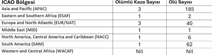 2024 yılında, planlı ticari hava taşımacılığı kazaları 296 ölümle sonuçlandı. Bu sayı, 2023’teki 72 ölümden önemli bir artışa işaret ediyor. Ayrıca, 2023’te milyarda 17 olan ölüm oranında da milyarda 65 ölüme ulaşıldı. Ölümlü kaza sayısı, 2023’te 1 iken 2024’te 10’a yükseldi. Tablo 1 ICAO Bölge Ofisi’nin akreditasyon alanlarına göre ölümlü kaza ve ölüm sayılarını göstermektedir.