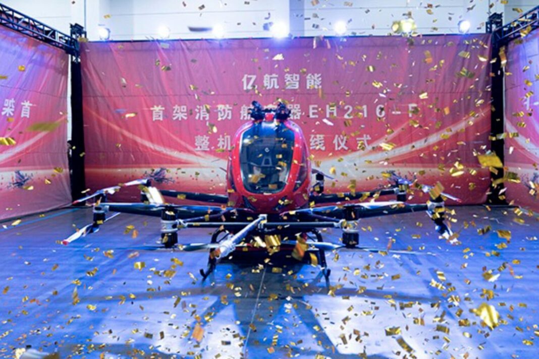 Çinli Gelişmiş Hava Hareketliliği (AAM) şirketi EHang, yangın söndürme için geliştirilen ilk elektrikli dikey kalkış ve iniş (eVTOL) uçağı olan EH216-F’nin, Pekin’in Fangshan Bölgesi’ndeki EHang Düşük İrtifa Acil Kurtarma Ekipmanları Genel Merkezi’nde üretim bandından çıktığını duyurdu.