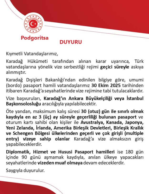 Karadağ’ın başkenti Podgoritsa’da yaşanan adli olay sonrası Türk vatandaşlarının, Karadağ’a vizesiz seyahatini askıya alındı. Karadağ Hükümeti, Türk vatandaşlarına uygulanan vizesiz seyahatin geçici olarak durdurulmasına karar verildiğini açıkladı.