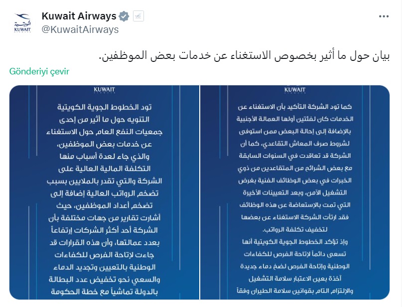 Havayolundan yapılan açıklamada, işten çıkarmaların Kuveyt vatandaşlarına fırsat yaratmak, iş gücünü canlandırmak ve işsizlik oranlarını azaltmak amacıyla başlatıldığı belirtildi.