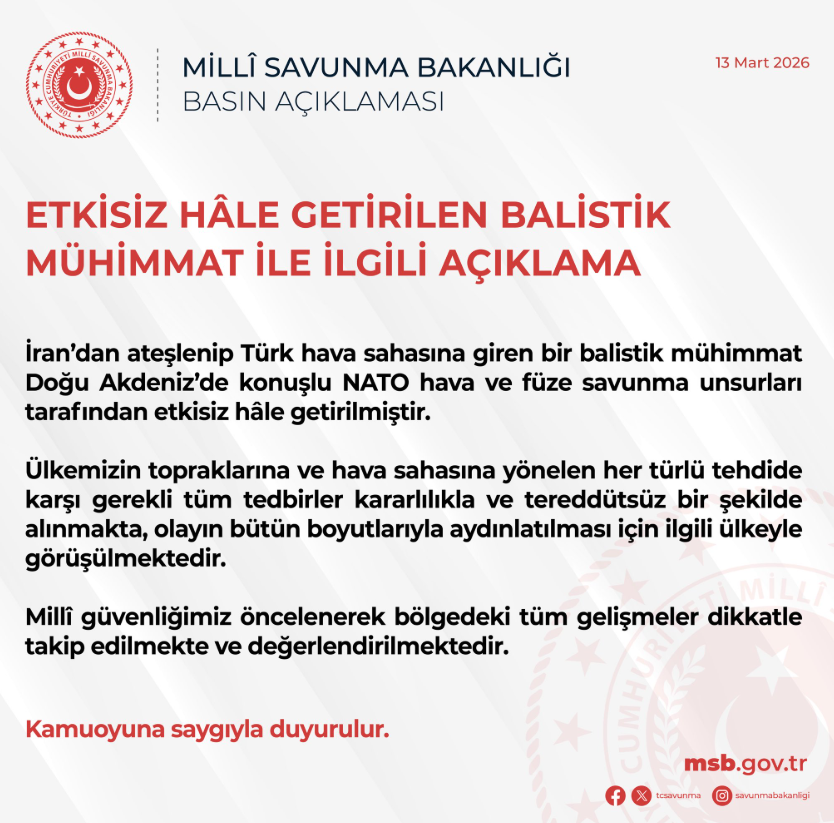 Açıklamada, İran’dan ateşlenip Türk hava sahasına giren bir balistik mühimmatın, Doğu Akdeniz’de konuşlu NATO hava ve füze savunma unsurları tarafından etkisiz hale getirildiği belirtildi.