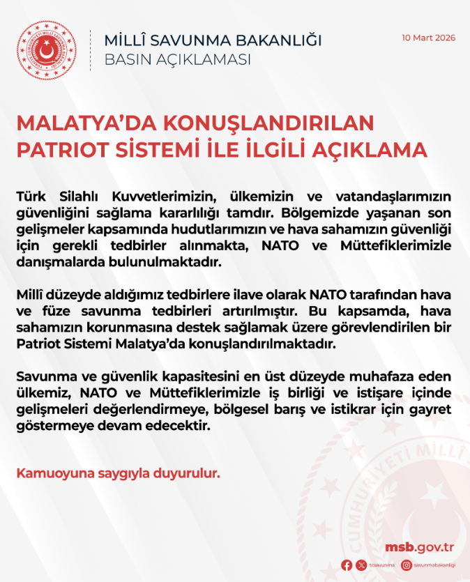 Bu kapsamda, hava sahamızın korunmasına destek sağlamak üzere görevlendirilen bir Patriot Sistemi Malatya’da konuşlandırılmaktadır. Savunma ve güvenlik kapasitesini en üst düzeyde muhafaza eden ülkemiz, NATO ve müttefiklerimizle işbirliği ve istişare içinde gelişmeleri değerlendirmeye, bölgesel barış ve istikrar için gayret göstermeye devam edecektir.”