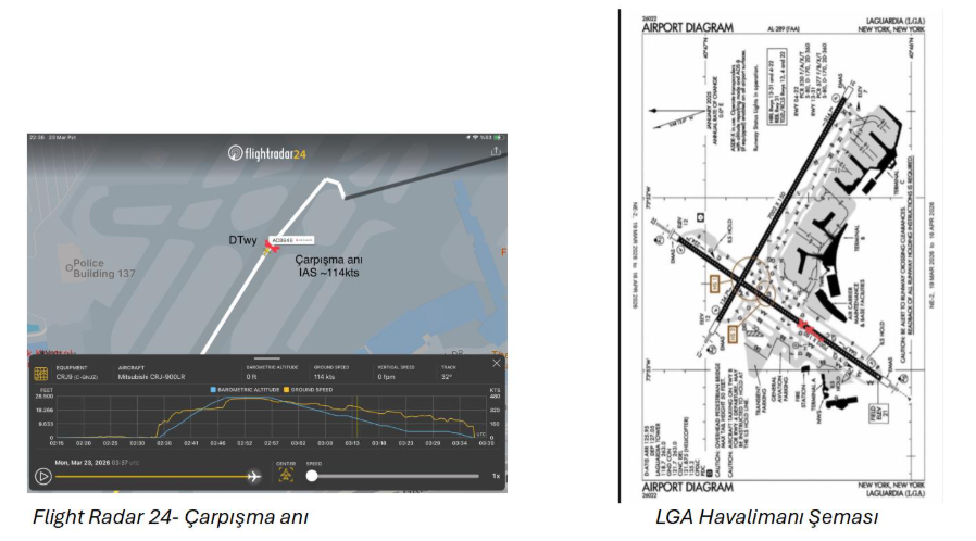 22 Mart 2026 Günü Montreal, QC (Kanada) – New York La Guardia,(LGA) NY (ABD) arasında AC-8646 seferini gerçekleştiren, 72 yolcu ve 4 mürettebatı bulunan Jazz Canadair CRJ-900 uçağına, 04 pistine iniş izni verilir.