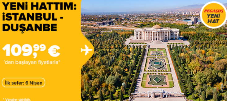 Pegasus’un 6 Nisan itibarıyla İstanbul Sabiha Gökçen Havalimanı kalkışlı, Tacikistan’ın başkenti Duşanbe‘ye uçuşları başlıyor!