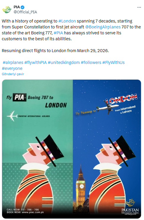 PIA, yaklaşık beş yıl aradan sonra geçen Eylül ayında İngiltere seferlerine yeniden başlamak için resmi onay almıştı. İlk olarak Manchester’a, ardından Birmingham’a ve şimdi de Londra’ya uçuşlar yeniden başlatıldı. Bu rotaların yeniden canlandırılmasının, iş, turizm ve kültürel bağları güçlendirmesi ve Pakistan diasporasına ve uluslararası yolculara sorunsuz bir yolculuk sunması bekleniyor.