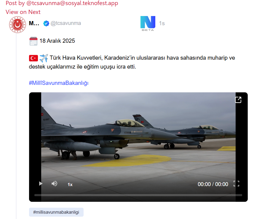 Bakanlığın NSosyal hesabından yapılan paylaşımda, 18 Aralık’ta Türk Hava Kuvvetlerinin, Karadeniz’in uluslararası hava sahasında muharip ve destek uçaklarıyla eğitim uçuşu yaptığı belirtildi.