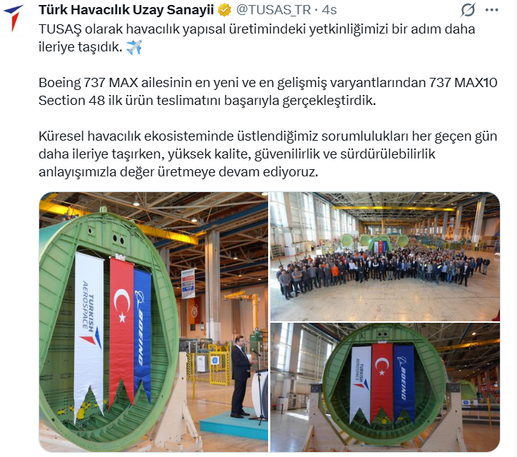 “TUSAŞ olarak havacılık yapısal üretimindeki yetkinliğimizi bir adım daha ileriye taşıdık. Boeing 737 MAX ailesinin en yeni ve en gelişmiş varyantlarından 737 MAX 10 Section 48 ilk ürün teslimatını başarıyla gerçekleştirdik. Küresel havacılık ekosisteminde üstlendiğimiz sorumlulukları her geçen gün daha ileriye taşırken, yüksek kalite, güvenilirlik ve sürdürülebilirlik anlayışımızla değer üretmeye devam ediyoruz.”
